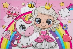 Een prachtige kinderpuzzel met een prinses en een eenhoorn zal jonge puzzelaars blij maken. Bevat 30 grote stukjes en vormt na het leggen een afbeelding van 29 × 18 cm. De puzzel is verpakt in een elegante cadeauverpakking met handvat – ideaal als cadeau en voor onderweg.