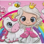 Deze sprookjesachtige puzzel met prinses en eenhoorn is ideaal voor de eerste puzzelervaringen. De grote, goed hanteerbare stukjes stimuleren de fijne motoriek, geduld en logisch denken van kinderen. Na het leggen ontstaat er een prachtige afbeelding waar kinderen dol op zullen zijn.
