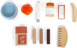 Een houten spuit met veermechanisme, medicijndoos en andere hulpmiddelen ondersteunen authentiek speelplezier bij de verzorging van het huisdier.