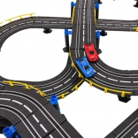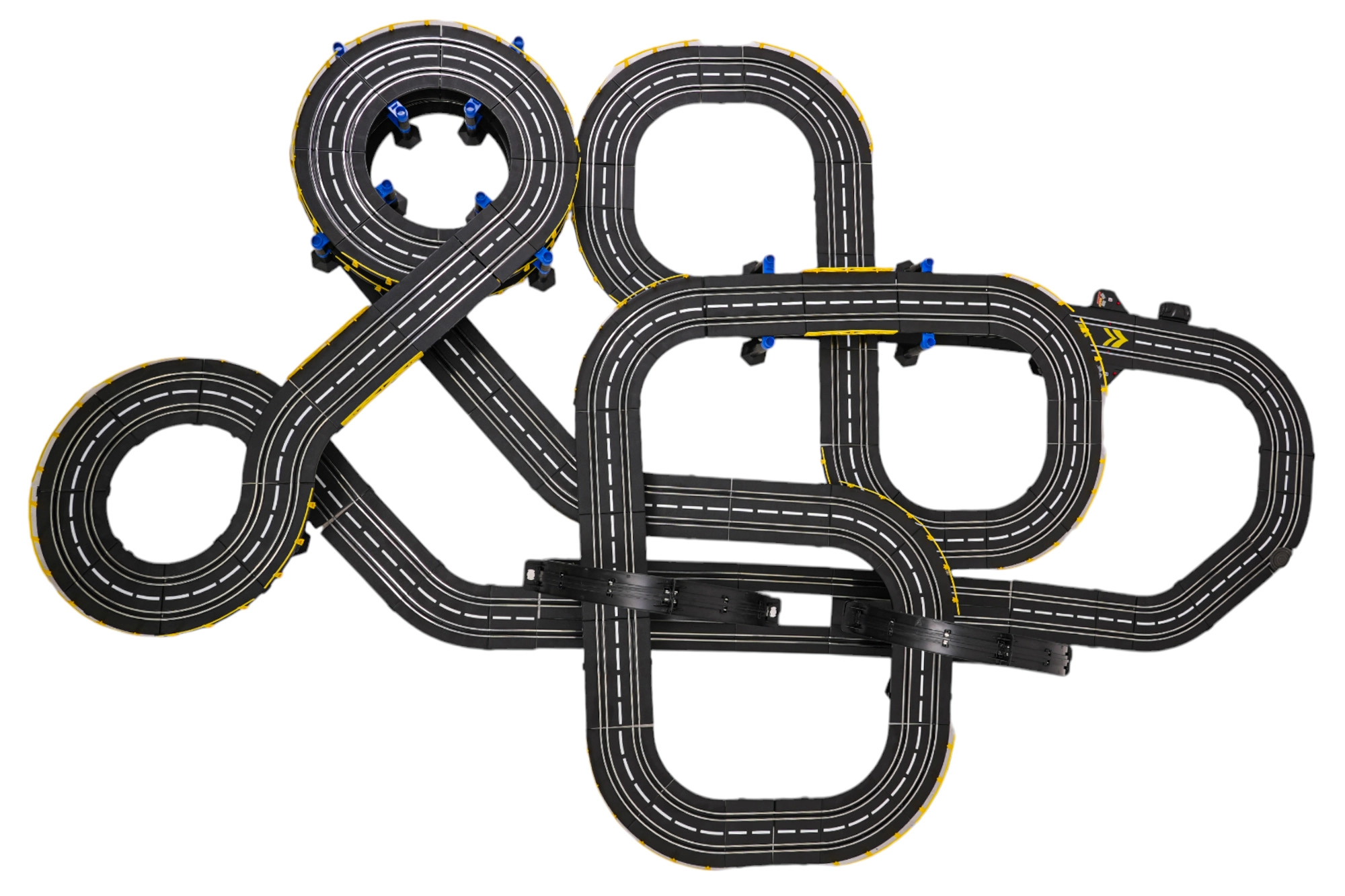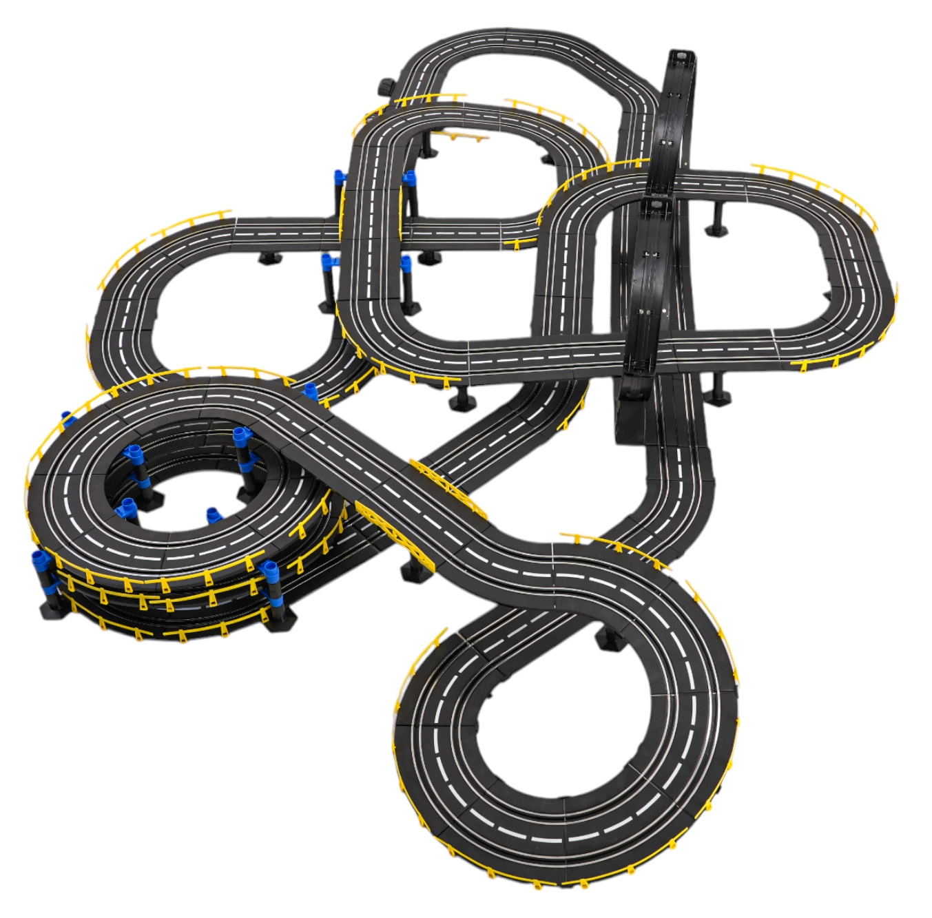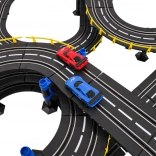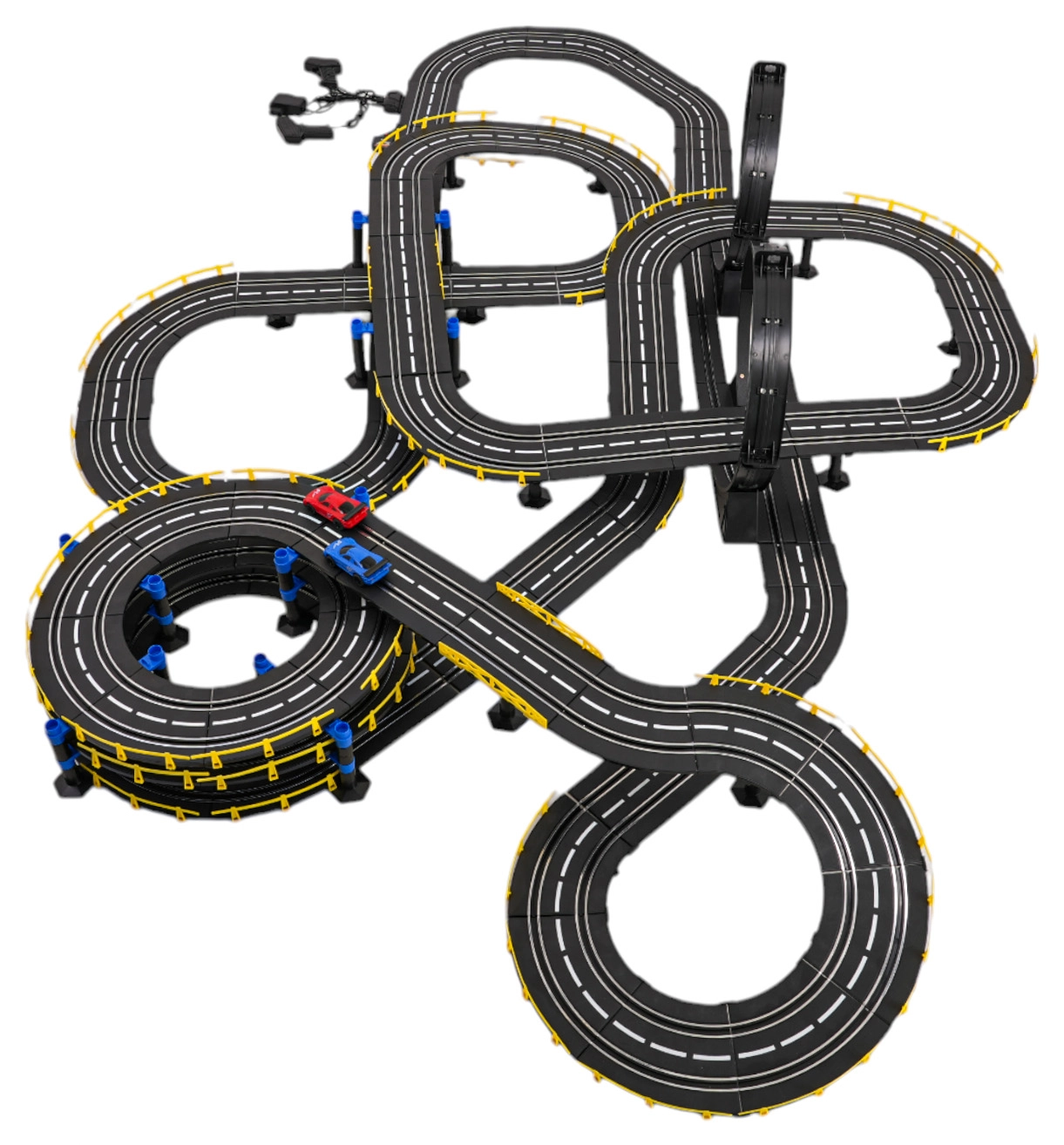 . | - 2 raceauto’s, .- 2 afstandsbedieningen, .- baan in losse delen, .- slagbomen, .- voeding, . |