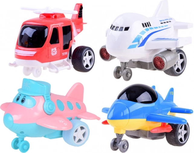 In de doos vind je drie kleurrijke vliegtuigen en een helikopter met wieltjes – klaar voor direct spelen en vervoeren.