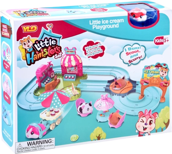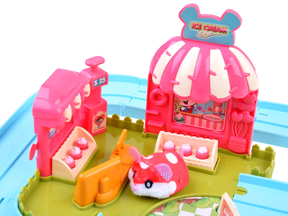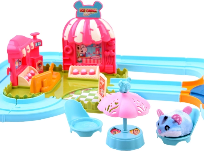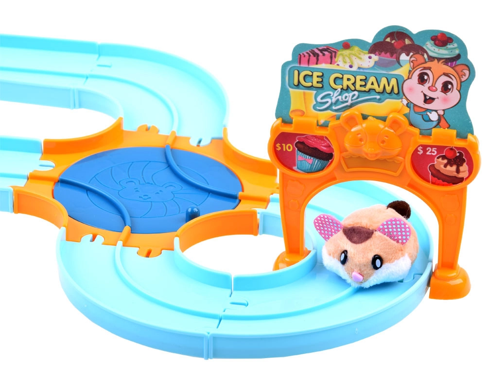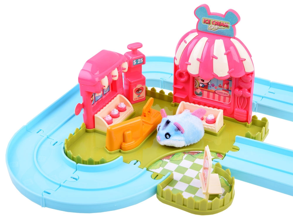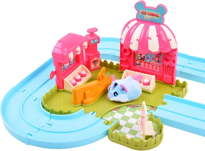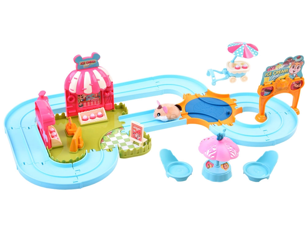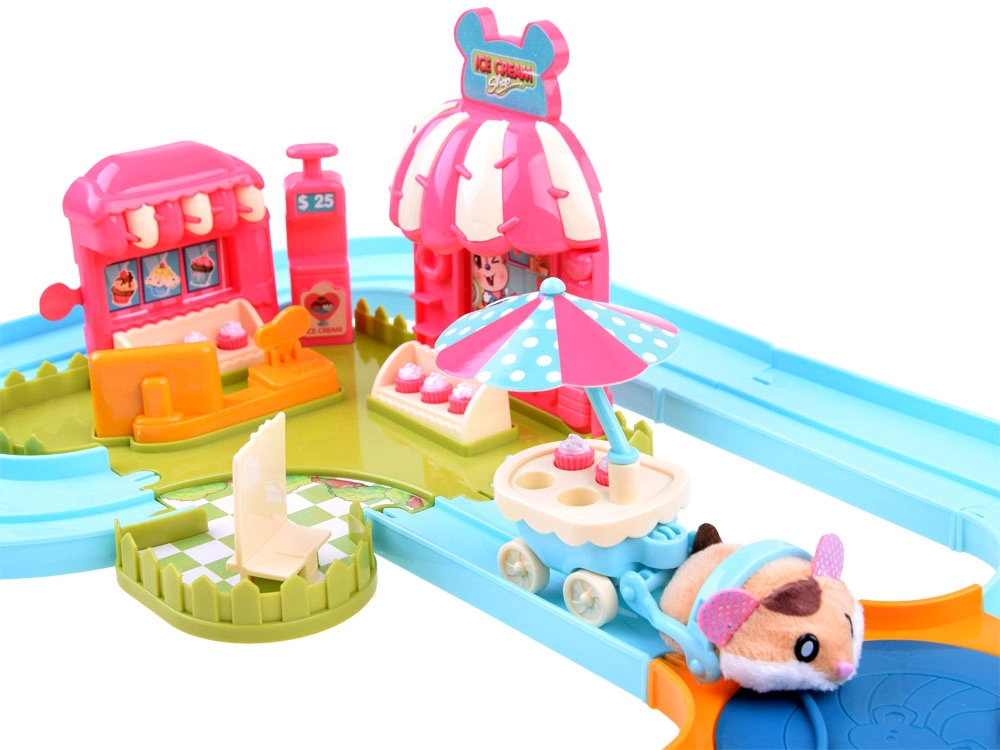 Deze speelset brengt de vrolijke wereld van een ijssalon tot leven met een schattig hamstertje met een superzachte vacht, klaar voor actie direct na het uitpakken – gevoed door een AG13-batterij (meegeleverd). Na het inschakelen rijdt het hamstertje weg, verandert automatisch van richting en kan het over de meegeleverde eenvoudig te monteren baan met wissel worden geleid. Met het aangekoppelde karretje bezorgt het lekkernijen aan de gasten.