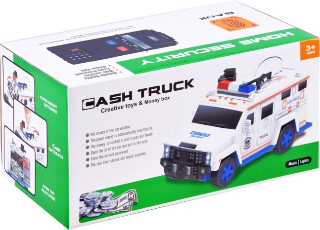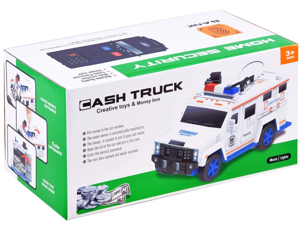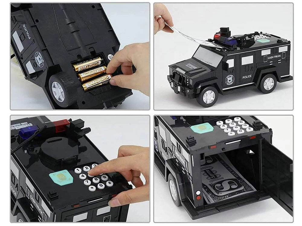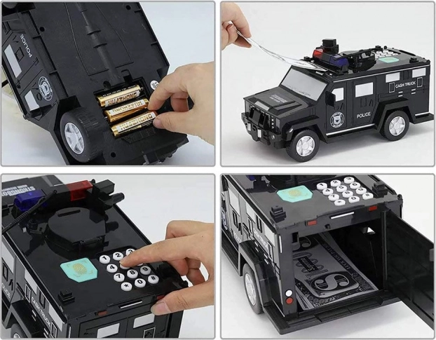Deze interactieve spaarpot in de vorm van een politieauto beschermt kindersparen en vermaakt tegelijk. Kinderen voeren een beveiligingscode in (standaard 0000), bevestigen via de vingerafdrukscanner (simulatie) en openen de kluisdeur. Bankbiljetten worden automatisch ingevoerd via de voorste sleuf, munten via de bovenopening onder de klep.