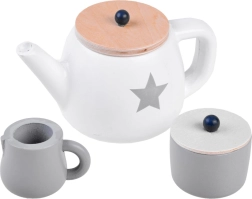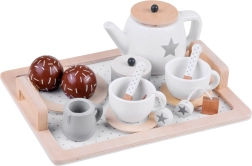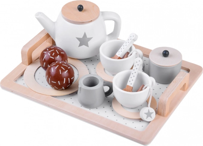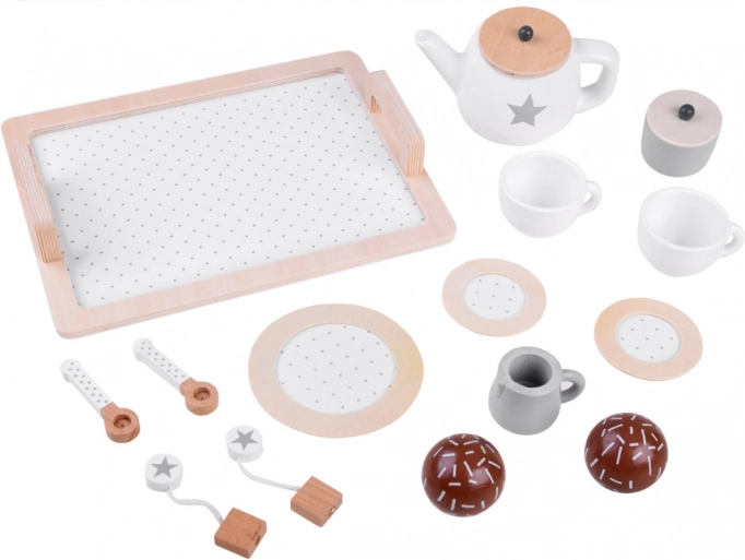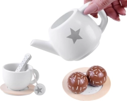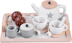 Stijlvolle houten theeset in zachte beige en witte tinten voor een veilige theepartij. Bevat een dienblad, theepot, kopjes, schoteltjes, suikerpot, melkkannetje en houten lekkernijen – alles met schattige sterren- en stipmotieven. Duurzame houtafwerking met gladde randen en niet‑toxische verven stimuleert de fantasie en sociale vaardigheden van kinderen.