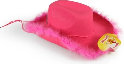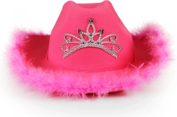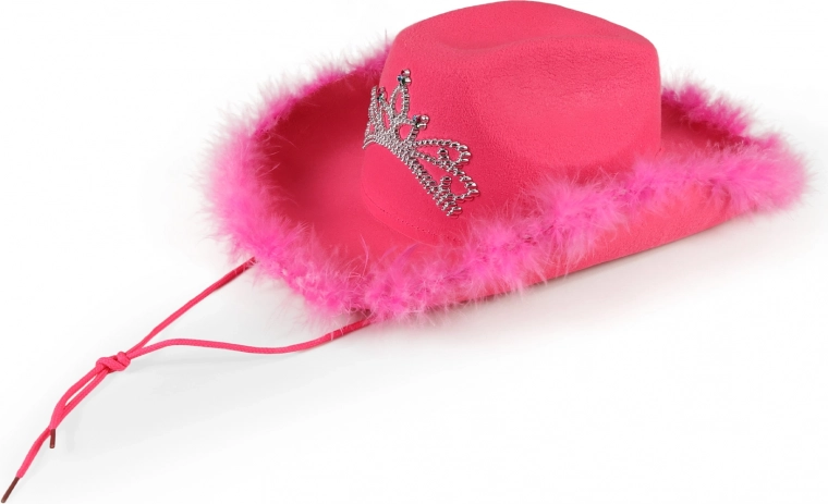 Een felroze cowboyhoed voor volwassenen met een kroon van steentjes en een verenrand geeft elk evenement een vleugje glamour. Dankzij het verstelbare koord blijft hij comfortabel op je hoofd zitten; de hoogte van de hoed is 15 cm – ideaal voor feestjes, carnaval of een vrijgezellenfeest.