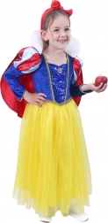 Verander je in een oogwenk in de charmante Sneeuwwitje! Dit kinderkostuum in maat S voor meisjes van 4–6 jaar (105–116 cm) is versierd met blauwe pailletten, gouden details en een afneembare rode cape met witte kraag. Ideaal voor carnaval, verkleedfeestjes en sprookjesspel. Haarstrik niet inbegrepen.