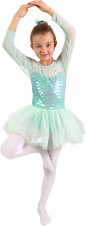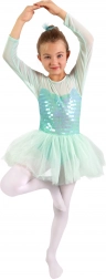 Elegante balletjurk met lange mouwen van fijn mesh en een luchtige tule rok die elke stap van de kleine danseres accentueert. Glanzende pailletten geven het kostuum een opvallend effect, terwijl de zachte materialen comfort en bewegingsvrijheid garanderen.