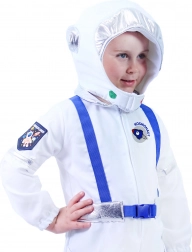 De witte overall met zilverkleurige elementen en patches zorgt voor een realistische space-look die elke kleine ontdekker zal verrassen.