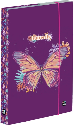 Praktische schoolbox voor schriften in A5-formaat met vlindermotief. Beschermt je schriften en papieren dankzij duurzaam laminaat, heeft sluiting met elastiek en een rug van 3 cm voor meer inhoud.