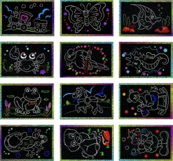 Ontdek creatieve fun voor de allerkleinsten: een set glinsterende krasplaatjes in het formaat 15 × 10 cm. In plaats van fijne lijntjes te krassen wordt de hele afbeelding weggekrast – net als bij een kraskaart – waardoor kleurrijke, glanzende motieven ontstaan, geschikt voor kinderen vanaf 3 jaar.