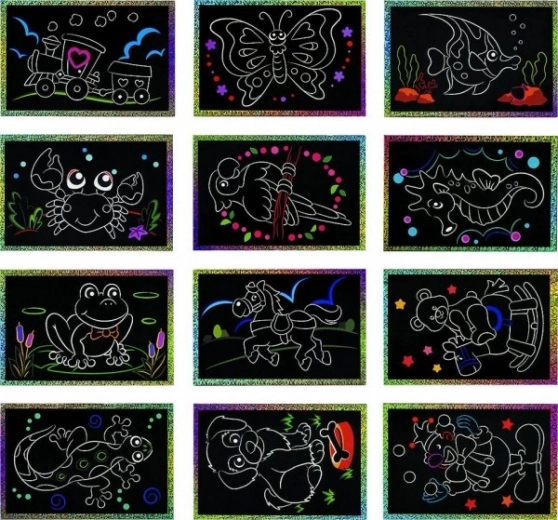Ontdek creatieve pret voor de kleintjes: een set glinsterende krasplaatjes in het formaat 15 × 10 cm in een praktische box van 24 stuks. In plaats van fijne lijntjes te krassen wordt de hele afbeelding weggekrast – vergelijkbaar met een kraskaart – waardoor kleurrijke, glanzende motieven ontstaan, geschikt voor kinderen vanaf 3 jaar.