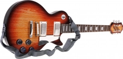 De bruine uitvoering met de vorm van een elektrische gitaar, schouderriem en bedieningselementen zorgt voor een authentieke speelervaring.