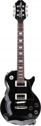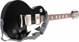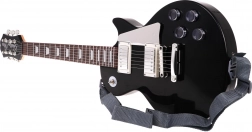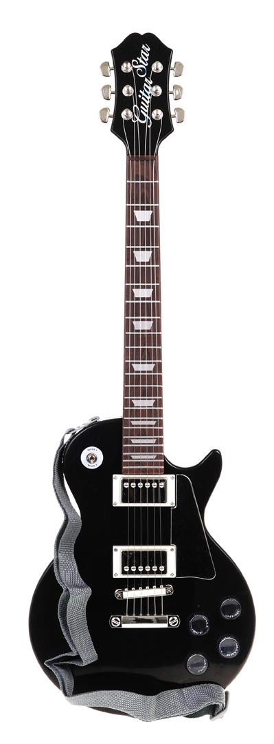 - zwarte elektrische gitaar, headsetmicrofoon, schouderband