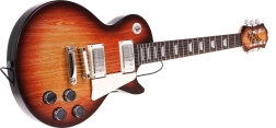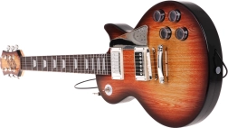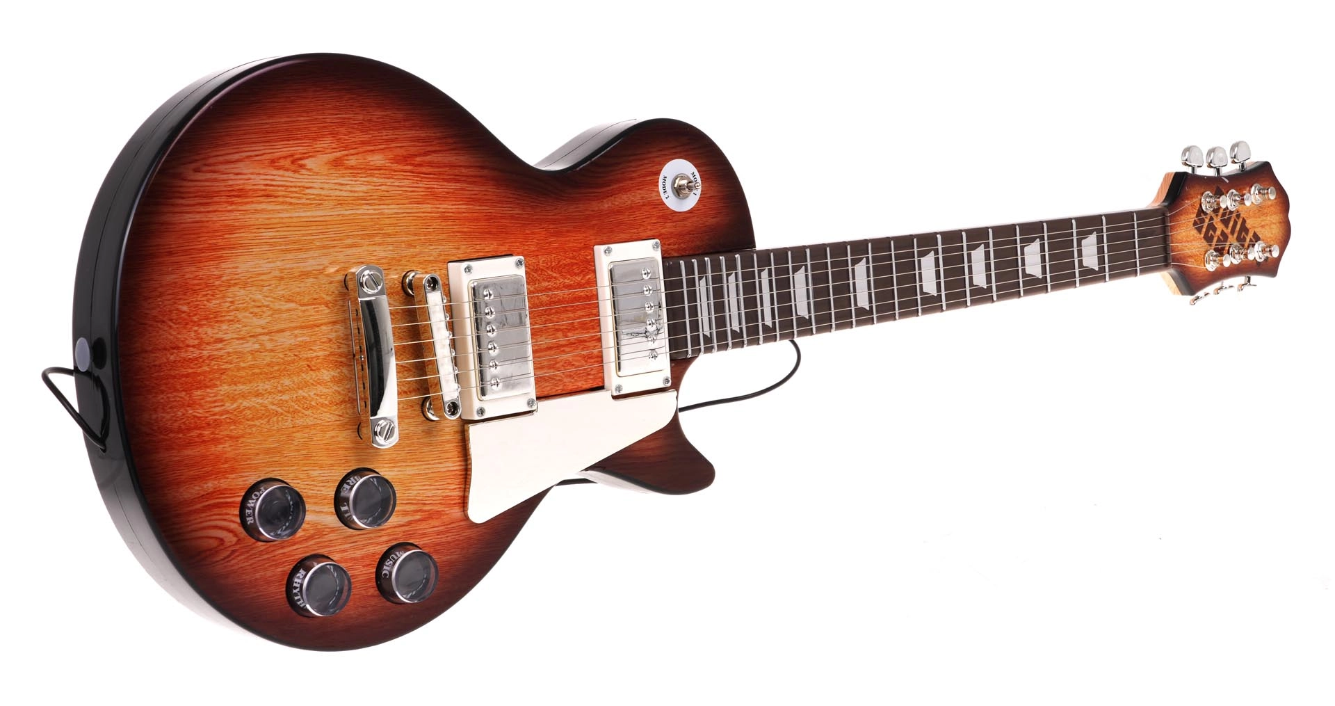 De gitaar in bruine “sunburst”-stijl met bedieningsknoppen en schouderriem motiveert kinderen om muziek te maken. Voorgeprogrammeerde ritmes en melodieën helpen bij de eerste stappen.