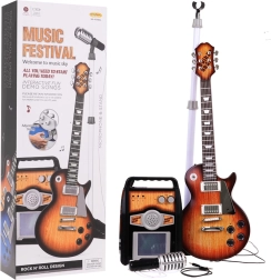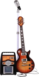 Deze creatieve muziekset is een ideale keuze voor kinderen vanaf 3 jaar. De elektrische gitaar in het bruin oogt als een echt instrument; je sluit hem met de meegeleverde kabel aan op de versterker en je kind kan meteen spelen en zingen in de microfoon op het stabiele statief. De versterker maakt afzonderlijke volumeregeling van gitaar en microfoon mogelijk en biedt ingangen voor gitaar, microfoon en ook voor een extern MP3-apparaat. Voor de sfeer zorgen gekleurde lampjes die op het ritme knipperen.