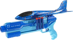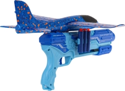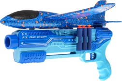 Het blauwe pistool functioneert ook als launcher voor het glijvliegtuig – het vliegt ver en zorgt voor veel beweging in de tuin en op het speelveld.