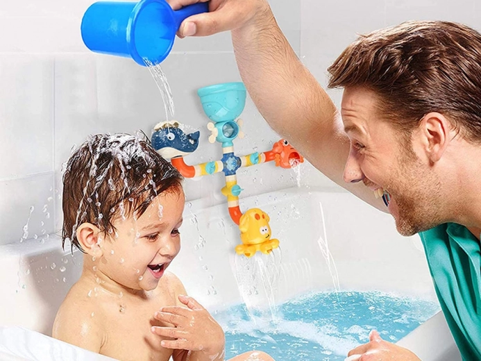 Deze interactieve waterset verandert elk badmoment in een spel. Giet water in de bovenste trechter en volg de stroom door de buisjes, die onderdelen laat draaien en fonteinen en watervallen creëert. Onderdelen met octopus-, walvis- en krabmotieven kun je eenvoudig herschikken om nieuwe routes te maken.