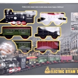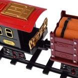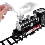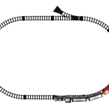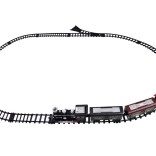 Het stoom-effect activeer je eenvoudig met de meegeleverde pipet – vul gewoon water in het reservoir achter de schoorsteen. De aan/uit-schakelaar biedt twee rijmodi: 1) rijden + licht + geluid + stoom, 2) rijden + licht + stoom (zonder geluid). Inbegrepen zijn een ovale baan met 12 delen, drie personen- en twee goederenwagons, railkoppelingen, accu en USB-oplaadkabel.