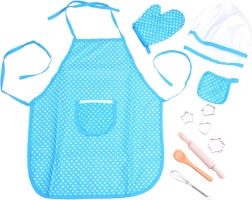 Schattige kookset voor kleine keukenhelpers die kleding beschermt en kinderen motiveert om te koken en bakken. Bevat een schort, koksmuts, ovenhandschoen, onderzetter en praktische tools – deegroller, houten lepel, garde en metalen uitsteekvormpjes. Geweldig voor samen koken, fantasie stimuleren en spelen als echte pro’s.