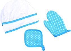 Muts met elastiek, schort met zak en een hittebestendige ovenhandschoen met onderzetter beschermen kleding en handen, en kinderen voelen zich echte koks.