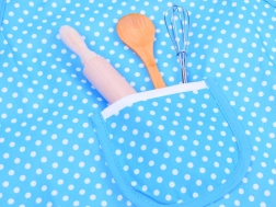 - Schort, koksmuts, ovenhandschoen, textielen onderzetter, houten deegroller, houten lepel, metalen garde, 4 metalen uitsteekvormpjes
