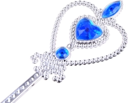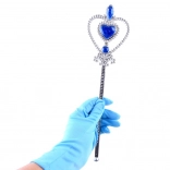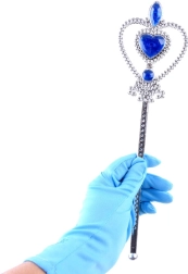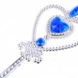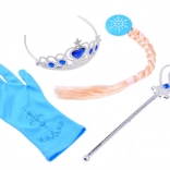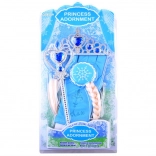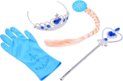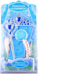 De blauwe decoratieve speld met daaraan een schattige blonde vlecht is eenvoudig te dragen en helpt om je te laten lijken op je favoriete sprookjesboek-personage. De kroon en scepter zijn onmisbare accessoires voor elke prinses, daarom zijn ze vakkundig vervaardigd en versierd met blauwe plastic juwelen. De doos met elegant versierde kaviaar complementeert de outfit van het meisje.