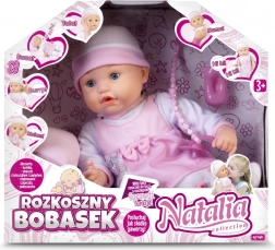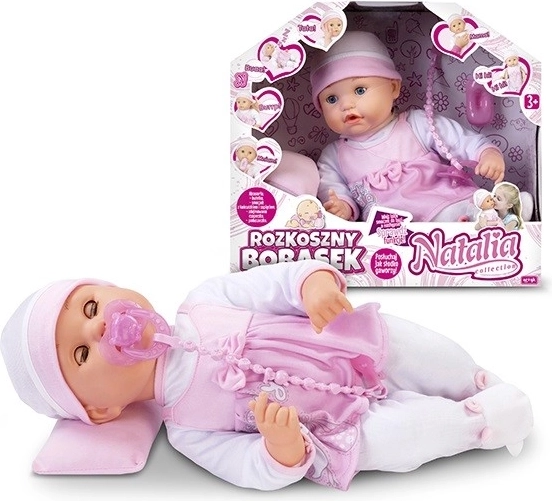 De interactieve babypop met accessoires van de Natalia Collection is net echt: reageert op aanraking en beweging, maakt realistische geluiden (lachen, huilen, slapen), zegt “mama” en “papa” en boert na het voeden met het flesje. Zacht lijfje, speen en kussentje inbegrepen – de ideale speelpop voor kinderen vanaf 2 jaar.