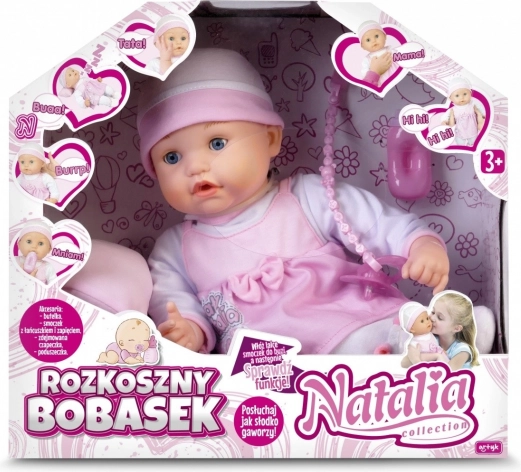Ontdek deze schattige interactieve babypop die fantasie en zorgzaamheid stimuleert. De pop reageert op het aanbieden van flesje of speen, op aanraking van kin, wangetjes en buikje en op wiegen. Ze kan “mama” en “papa” zeggen, lacht, huilt, snurkt zachtjes in haar slaap en boert na het eten. Dankzij het zachte lijfje is ze heerlijk om te knuffelen en perfect als eerste pop.
