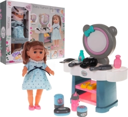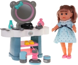 De pop heeft prettig haar om te kammen, beweegbare armen en benen en produceert bij het vullen met water realistische kindergeluiden zoals lachen en huilen. De set omvat diverse verzorgings- en cosmetische tools, zoals parfums, kam, borstel, spiegeltje en andere magische accessoires. De pop werkt op 3 x LR44-batterijen (inbegrepen), terwijl de kaptafel 4 x AA-batterijen vereist (niet inbegrepen).