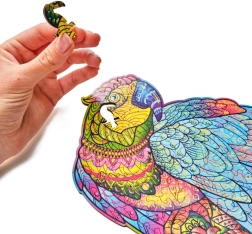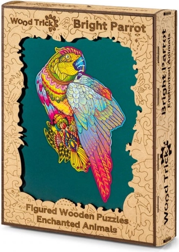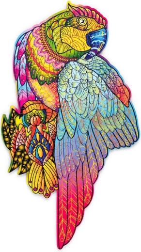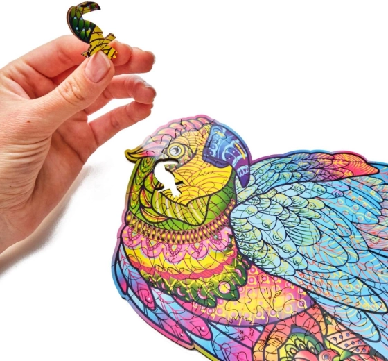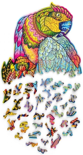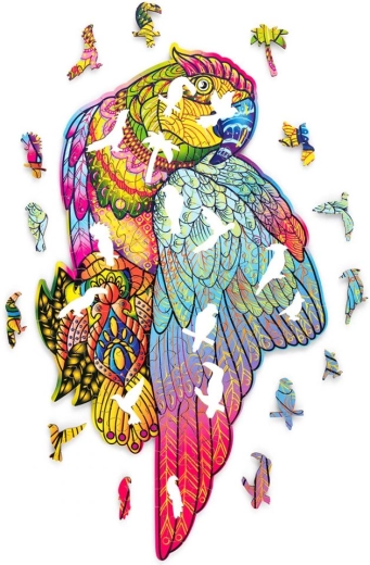 De houten puzzel in de vorm van een kleurrijke papegaai met complexe patronen en felle kleuren spreekt iedereen aan die van uitdagingen houdt.