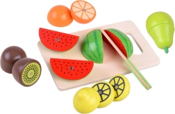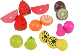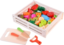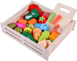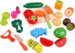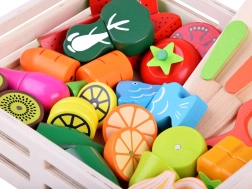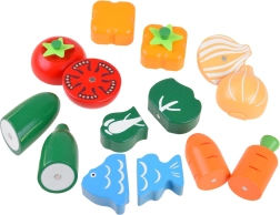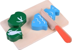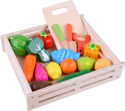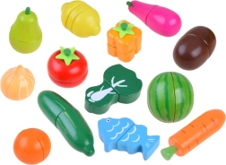 Deze houten set bevat een gevarieerde selectie fruit, groenten en vis, allemaal voorzien van magneten voor gemakkelijke deling in stukken. Elk stuk is vervaardigd uit kwaliteitsvol hout en geschilderd met niet-giftige verf die de veiligheid voor de kleintjes waarborgt.