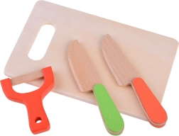 Houten kist, snijplank, dubbelzijdig mes, dunschiller, diverse soorten fruit en groenten zoals tomaat, wortel, komkommer, paprika's, aardbeien, kiwi en meer.