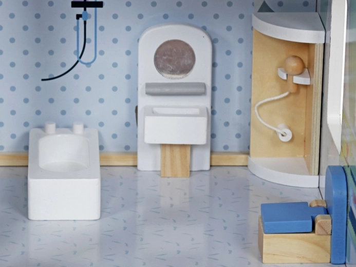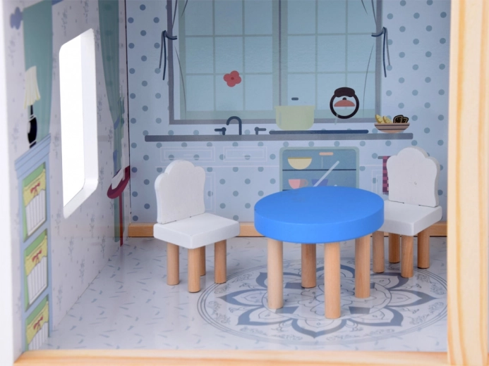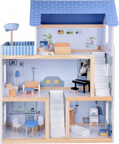 Een houten poppenhuis is de vervulling van de droom van elk meisje. Zeker als ze geen liefhebber is van felle kleuren: dit ingetogen, blauw-getinte huisje zal haar zeker bevallen.
