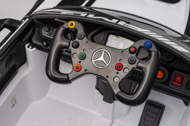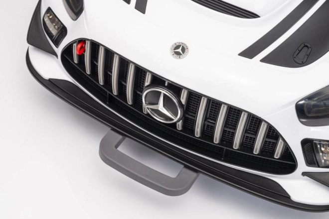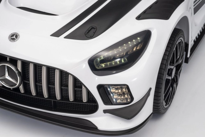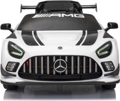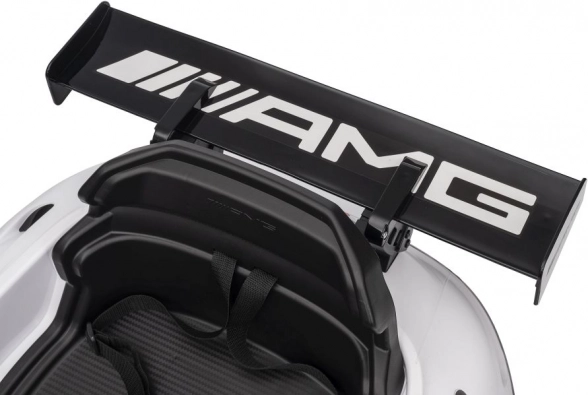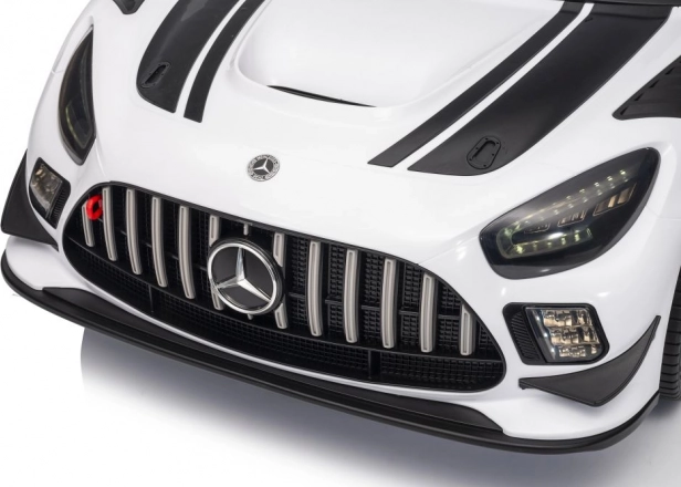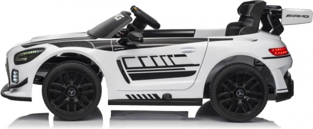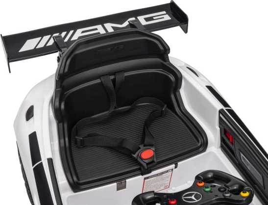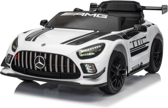 Stijlvolle elektrische kinderauto MERCEDES AMG GT3 in elegant wit met realistische details, een sportieve spoiler en LED-verlichting. Ideaal voor kleine bestuurders die van snelle auto’s en plezierig rijden houden. De veilige stoel met gordel en de mogelijkheid tot afstandsbediening voor ouders zorgen voor comfort en veiligheid bij elke rit.