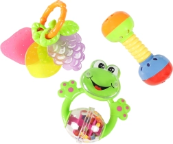 Deze kleurrijke set van 3 stuks bevat een kikker-rammelaar, een halter met rammelende elementen en een bijtring in de vorm van fruit. De speeltjes zijn licht, veilig en zo ontworpen dat een baby ze gemakkelijk kan vastpakken. De geluiden en contrasterende kleuren prikkelen de nieuwsgierigheid en ondersteunen de zintuiglijke ontwikkeling.
