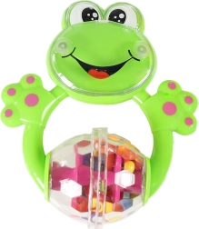 Lichte rammelaar met een lachende kikker en kraaltjes in het transparante midden stimuleert het gehoor en de oog-handcoördinatie.