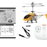 - Helikopter, IR-afstandsbediening, USB-oplaadkabel, reserve-achterrotor, handleiding