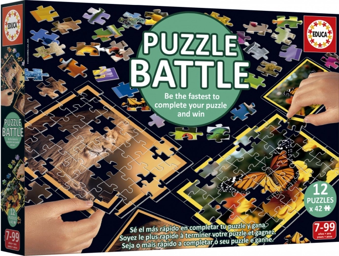 Ontdek het unieke puzzel-battleconcept van het merk EDUCA. In de doos vind je 12 afzonderlijke mini-puzzels, elk met 42 stukjes, en 12 voorbeeldkaartjes. Ideaal voor korte competitieve rondes of lange middagen vol familieplezier.