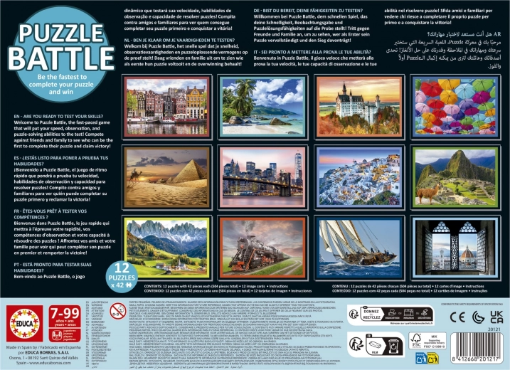 Geniet van een spannende puzzelstrijd met de EDUCA-set, die klassieke fun combineert met focus op snelheid, competitie en vaardigheidsontwikkeling. In de doos vind je 12 afzonderlijke puzzels van 42 stukjes en 12 voorbeeldkaartjes – ideaal om te spelen met vrienden en familie. Elke voltooide puzzel meet ca. 17 × 12,3 cm.