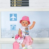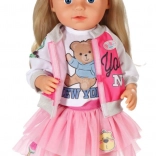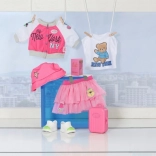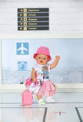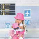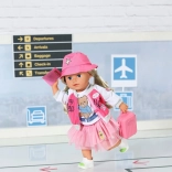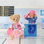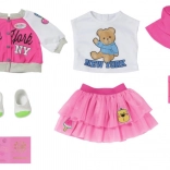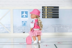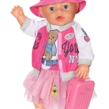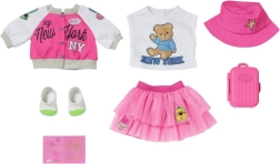 Gun je BABY BORN-pop de perfecte outfit voor op reis. Deze roze getinte set combineert comfort en stijl – van het lichte jack met iconisch NY-motief en het speelse T-shirt met beertje tot de luchtige tule rok en comfortabele schoentjes. Inclusief schattig koffertje en paspoort voor realistische speelscenario’s.