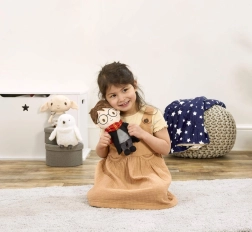 Deze officieel geïnspireerde knuffel draagt de iconische zwarte mantel en een rood-gele (Griffoendor) sjaal, die samen met de ronde bril en het bliksemlitteken trouw herinneren aan de geliefde tovenaar. Perfect voor de zintuiglijke ontwikkeling en rustgevende rituelen voor het slapen.