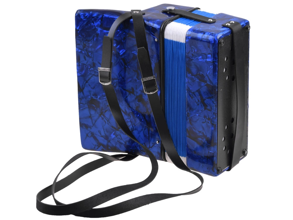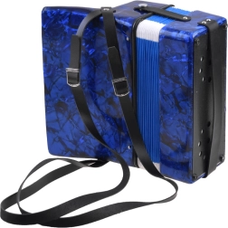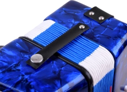 Glanzende blauwe behuizing met marmer-effect, toetsen en basknoppen. De accordeon klinkt helder en prettig – ideaal voor de eerste muzikale ervaringen.