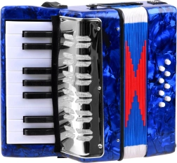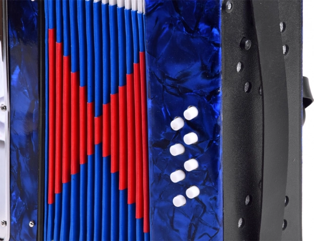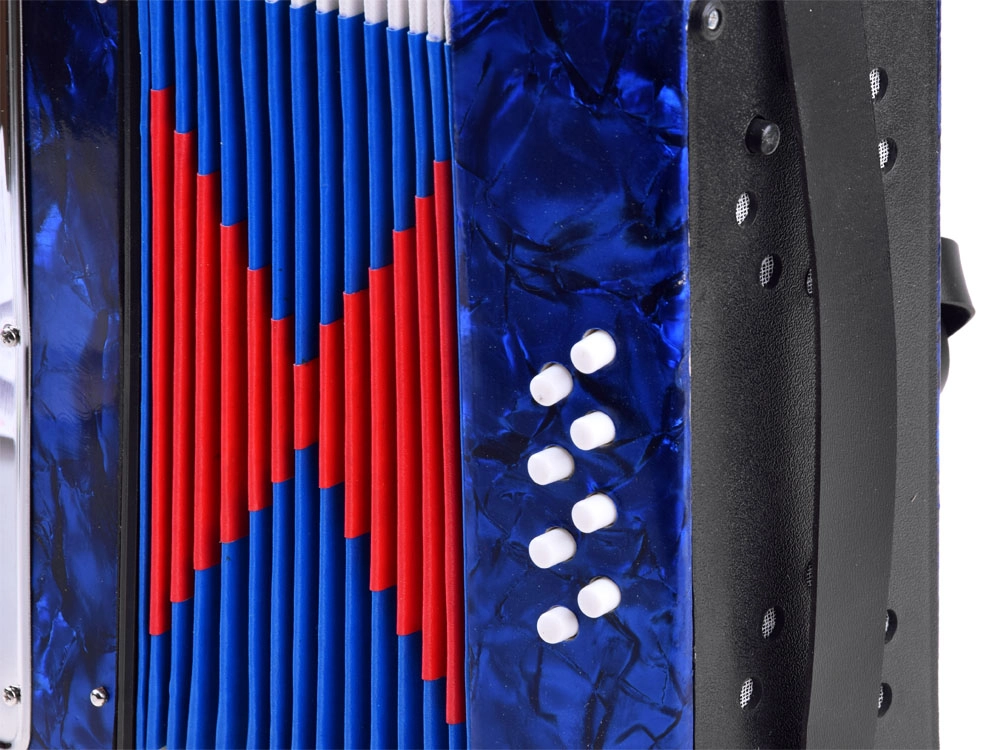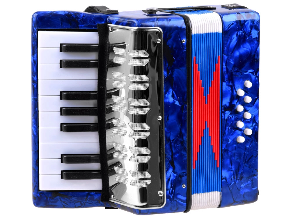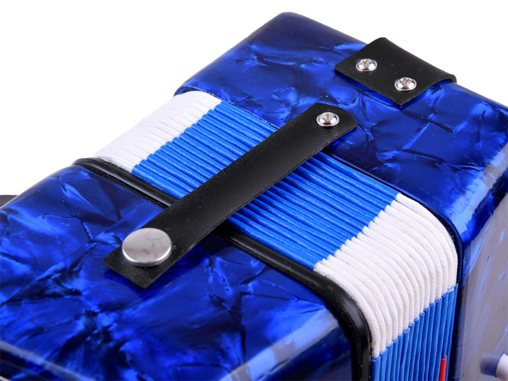 Realistische look en functies – de kinderaccordeon ziet eruit en werkt als een echt instrument: het geluid ontstaat door de balg uit te trekken en in te drukken, met zowel toetsen als basknoppen. Dankzij de hoogwaardige afwerking en de glanzende blauwe afwerking is hij aantrekkelijk en duurzaam.