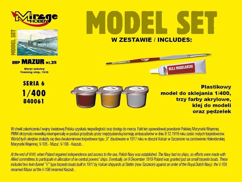 Bouw de iconische Poolse oefen-torpedobootjager ORP Mazur in de versie wz.35. Dit plastic model om te lijmen blinkt uit door scherpe details en een uitstekende pasvorm zonder onnodige complicaties. Een geweldige keuze voor iedereen die zijn collectie historische marineschepen wil uitbreiden.