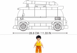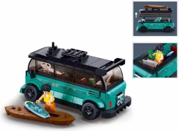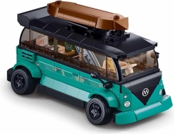 De bouwset biedt een gedetailleerd model van de surfwagen met realistische kenmerken zoals ramen, wielen en een dakdrager.