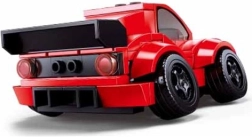 De set bevat een gedetailleerde raceauto met snelheidsaccenten, zoals een achterspoiler en stevige banden.