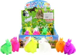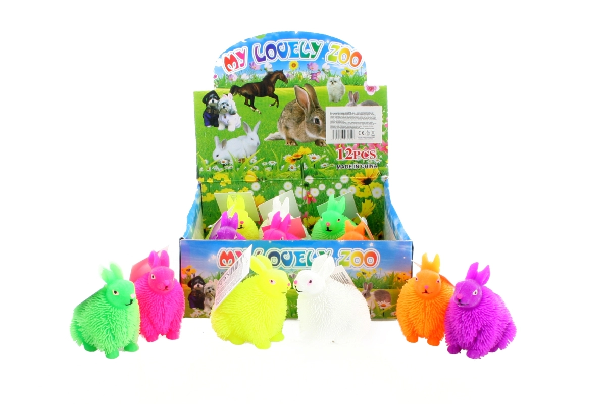 Rubberen, ruig (harig) konijntje. Binnenin zit een lichtgevende bal die knippert. Afmetingen ca. 8 x 7 x 5 cm. Leeftijd 3+