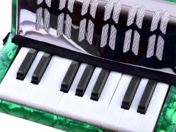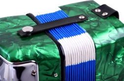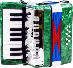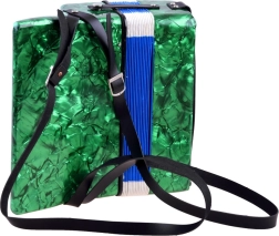 Ontdek de vreugde van muziek met deze grote kinderaccordeon in een groene uitvoering. Hij ziet eruit als een echt instrument, stimuleert de fijne motoriek, het muzikale gevoel en het leren toonhoogtes te onderscheiden. Dankzij de toetsen en basknoppen, de comfortabele riem en de vergrendelclip voor de balg is spelen eenvoudig en veilig – ideaal voor beginnende jonge muzikanten.