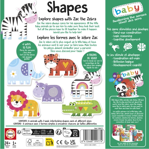 Maak je kleine onderzoeker op een speelse manier vertrouwd met vormen. De EDUCA baby inlegpuzzel ontdek vormen met zebra Zak helpt kinderen vanaf 24 maanden vierkant, driehoek, cirkel en rechthoek te onderscheiden door dierenafbeeldingen te koppelen aan twee verbonden vormen.