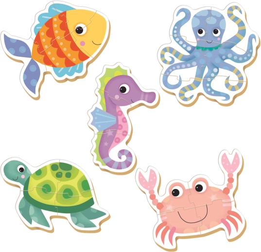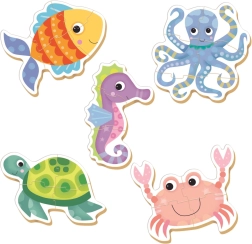 Een visje, octopus, zeepaardje, schildpad en krab in vrolijke kleuren trekken de aandacht en motiveren om te puzzelen.